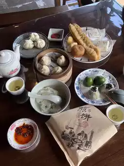 At 7:30 AM, we took a peaceful morning stroll. Unlike the bustling daytime, the alleys were quiet, as only guests staying inside the scenic area could roam around. Breakfast was a spread of local delicacies like osmanthus cakes, and everything was self-serve & unlimited—absolutely delicious!