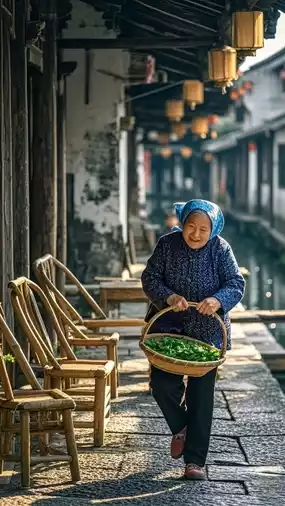 The riverside corridors are Anchang’s most captivating scenery. These eaves, built during the Ming and Qing dynasties, are supported by weathered wooden pillars, providing three kilometers of shade and shelter from rain. Sitting on a bamboo chair under the corridor, I watched sunlight filter through the wooden lattice windows, casting scattered light spots on the bluestone slabs. An elderly woman wearing a blue cloth headscarf walked slowly by, carrying a bamboo basket filled with freshly picked greens, vibrant and dripping with freshness. She blended into the corridor scene, forming a living folk painting. These corridors are not just architecture but the stage of life for Anchang’s people—children play here, elders chat, merchants trade, enduring wind and rain for centuries.
