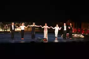 Lina Beckman’s portrayal of Agave was incredible! The plot revolves around the city of Thebes. She is driven into madness by Dionysus, and when she appears carrying the "prey’s head," her eyes are wild, speaking crazily about the hunt, yet a faint, almost imperceptible sadness hides at the corner of her mouth. When her father reveals that the head is her own son Pentheus, she suddenly bursts into uncontrollable laughter—strange and desperate. The next moment, she breaks down, piecing together a "son" with a wooden bucket, her trembling fingertips full of drama. Accompanied by the heart-shaking drumbeats, her bursting veins and explosive power could be felt even from across the seats. After the show, the applause was thunderous, and she took three curtain calls without stopping!