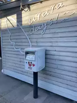 Mail posted in this postbox will be stamped with a postmark featuring an olive tree or Angel Road design.