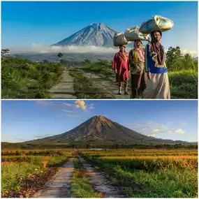 In Supit Village near Probolinggo, this rice field spot frames Mount Semeru perfectly. The viewpoint lies southeast of Semeru, 65 km (2h50m drive) from Cemoro Lawang.