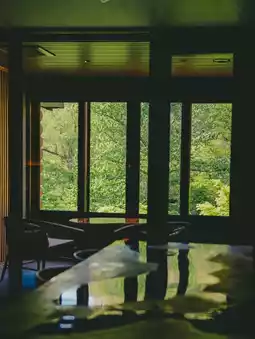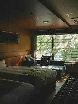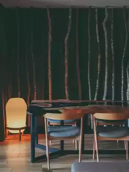 The room design is also full of attention to detail, with an interior wall made of kobushi wood, a dining table inspired by the flow of a mountain stream, and even a lampshade inspired by mushrooms!