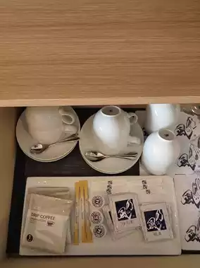 The room is stocked with coffee bags, roasted green tea, and green tea bags.