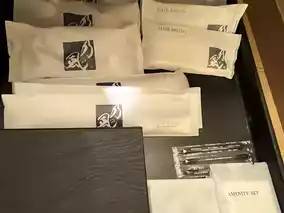 The supplies include toothbrushes, toothpaste, combs, razors, and cotton swabs, all stored in drawers.