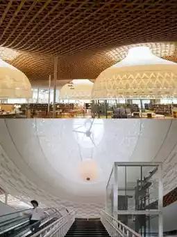 The decoration style inside the museum is particularly eye-catching. The Japanese cypress wood on the ceiling is arranged in a criss-cross pattern like waves, full of dynamic energy and interpreting the concept of "forest". Eleven huge, semi-transparent "domes" with beautiful textures hang from the ceiling, varying in size and pattern, designed with great imagination and stunning form.