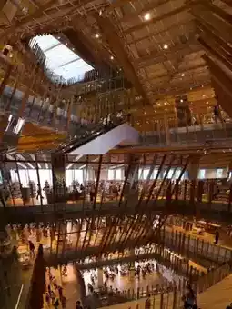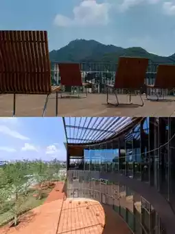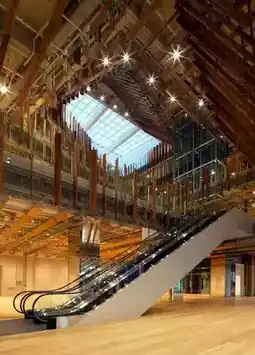 Walking into the building, I was amazed by the familiar "Kuma-style technique" - large parallel panels of locally produced cedar boards decorated on the ceiling, giving a feeling of walking in a towering forest. There is a large glass skylight on the roof, and natural light is projected from here, refracted onto the cedar boards and decorative glass, creating a soft lighting atmosphere and a comfortable visual experience.