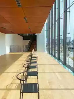 The glass-walled building reflects the sky and is beautiful from the outside, and once inside, the light pours in and the atmosphere is bright and comfortable🤍
