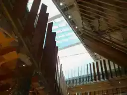 The culmination of this project is the Toyama Glass Art Museum (Photos 2-8). Located within the "TOYAMA KIRARI" public complex in the city center, the museum exhibits outstanding glass art and crafts from not only the prefecture and city, but also from around the world. Seeing the glass in person is captivating, not only for its beautiful sparkle, but also for its intricately crafted, streamlined shapes that are hard to believe given its hardness, and its rich colors, delicately interwoven with shades of light and shade. The vast potential of glass is truly astounding. The facility was designed by world-renowned architect Kengo Kuma (1954-), and is uniquely Toyama, inspired by the snow and rocks of Mount Tateyama. The dynamic structure, symbolized by the central atrium, and the way the glass's brilliance is reflected from multiple angles, make it easy to see why it is considered one of Japan's finest modern architectural masterpieces.
