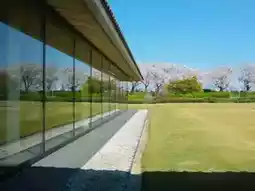 Toyama's rich design can be seen throughout the city. A prime example is the Toyama Prefectural Ink Museum of Art (Photos 1, 9-10). Located on the west bank of the Jinzu River, this public art museum houses many modern Japanese ink paintings. The collection includes works by masters such as Takeuchi Seihō (1864-1942) and Yokoyama Taikan (1868-1958), as well as works by local artists such as Takamura Gyujin (1901-1984), who was born in the prefecture and still retains a profound influence on Toyama. The single-story building that houses these works expresses the continuity of the Jinzu River, and within the neatly divided grounds, a single magnificent weeping cherry tree is in full bloom. From inside the museum, the tree's branches appear cut out like a painting, and with the piercing blue sky considered as the blank space, the entire scene itself seems to overlap with the techniques of ink painting. The ingenious, unhurried design, along with the Glass Museum, left me deeply impressed by the diversity of Toyama's spatial design.
