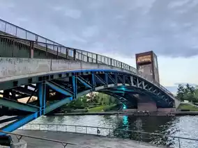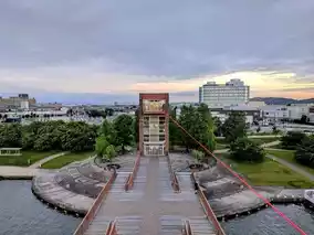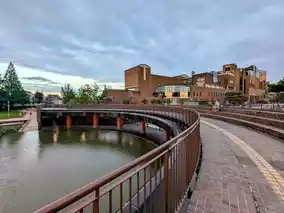 The park's iconic landmark is the Tenmon Bridge, which spans the canal and is flanked by brick-built observation towers on both ends. Visitors can enjoy panoramic views of the park and the majestic Tateyama Mountain Range from here. On the riverbank to the left, you'll find what is often referred to as Japan's most beautiful Starbucks.
