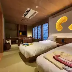 : Traditional and Western Japanese Style: Rooms are designed in a traditional Japanese style, featuring tatami mats, bed, and sliding doors.