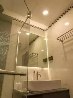 It is tiled with marble, which makes it look clean and luxurious like a condo. It looks very tasteful.