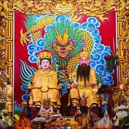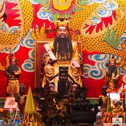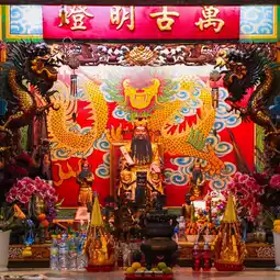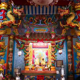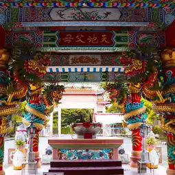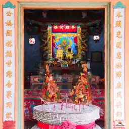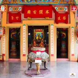 🎋🧨🙏Inside the shrine in the center is a platform where the City Pillar Shrine of Sia Ueng Kong is enshrined, along with two other deities: the left is the God of Fortune, Cai Xing Yea, and the right is the God of Earth, Kam Thiang Dai Ti. The outer part of the City Pillar Shrine is where the two main city pillars are enshrined. The tall pillar is the city pillar and the low pillar is the Shiva lingam pillar.