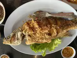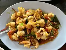 📍There are many types of food to choose from here. What we ordered were fried fish with fish sauce/sun-dried squid/steamed crab that was already peeled for us, very convenient to eat. It came with delicious seafood sauce/stir-fried seafood with holy basil/sour curry. The taste was delicious, rich, and full of flavor. The seafood was also very fresh.