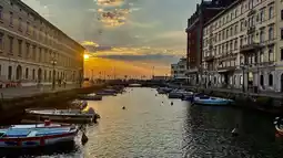 In the center of Trieste, there is a wide canal, facing which is a large cathedral. The guest docks near the port are now filled with private yachts, attracting not only locals but also a large number of tourists from all directions. The seaside boulevard is lined with bars and restaurants, bustling with people as the lights come on. In the deep water area in the distance, a huge cruise ship is docked, with many people carrying luggage heading towards the cruise.