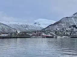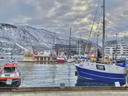 you can see various boats, snow-capped mountains in the distance, and even the Arctic Cathedral and Tromsø Bridge.