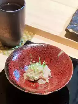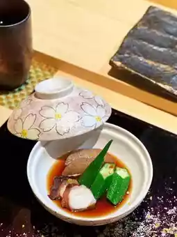 The silky tofu is dense and smooth, with a strong tofu flavor paired with broccoli; the Wakayama figs are delicate and soft, the fluorescent squid is plump with roe, fresh and with a taste of the sea; the Okinawan Mizu-uni is sticky, sour, and sweet.
