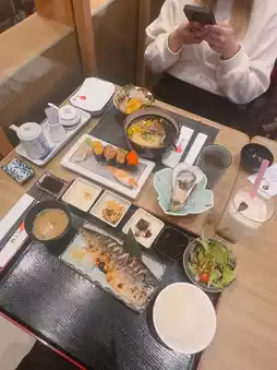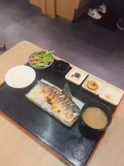 Salt-grilled mackerel set meal 🍱 Mackerel grilled until golden 😱 crispy outside and tender inside 😆 retained the juice ☺️ dipped in carrot puree sour sauce more appetizing 🥕 Comes with salad 🥗 appetizer 🧆 pickles, miso soup 🥣 pearl rice 🍚 dessert 🫘
