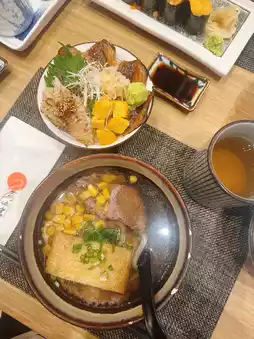 Grilled salmon Left mouth fish back yuzu rice with beef handmade udon 🍜 Salmon and left mouth fish back grilled after grilling full of fish oil 🔥 The meat is plump and tender 🤤 with sour ginger 🫚 Udon with beef 🥩 oil, corn 🌽