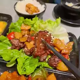 The beef cubes are smooth, honey draped with sweet peppers and potatoes, full of charred sweetness.