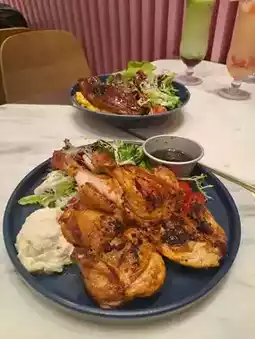 Grilled whole black truffle spring chicken with Japanese potato salad