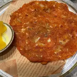 The kimchi pancake is crispy on the outside and soft inside, with a rich texture. Paired with crunchy pickled radish, the sour and spicy flavor is just right, making it hard to stop eating.