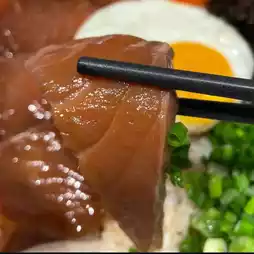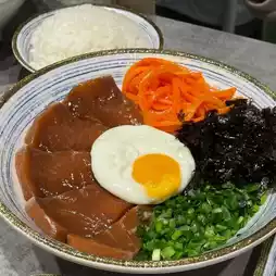 The salmon is marinated in a special soy sauce, fresh, juicy, and flavorful. Mixed with shredded radish, seaweed, and bean sprouts over rice, it adds layers of taste. The set also includes a drink and two appetizers, making it a great value.