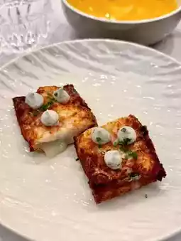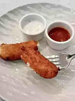 The crust is crispy on the outside, the cheese is threaded on the inside, and served with 2 appetizing specialty sauces, one is a sour cream with fresh lemon juice, and the other is a slightly spicy sauce with sweet watermelon juice