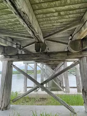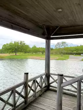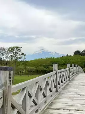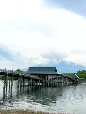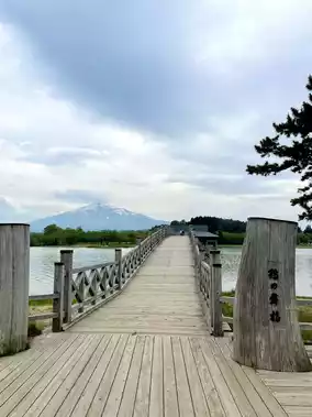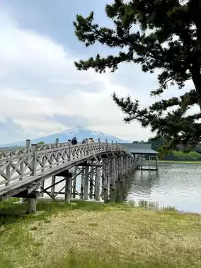 Total length 300m, width 3m 3000 pieces of Aomori cypress were used. As I crossed the gentle arched bridge, I looked back and saw the majestic Mt. Iwaki. I couldn't see it because it looked like it was about to rain ☔️, but on a clear day, the bridge reflected in the lake, the lake colored by the sunset on Mt. Iwaki, and Tsuru-no-mai Bridge are a magnificent sight.