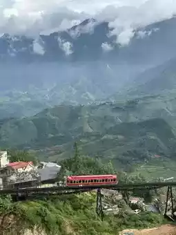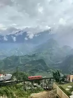 There is a balcony with a mountain view and a cable car up and down Fansipan peak
