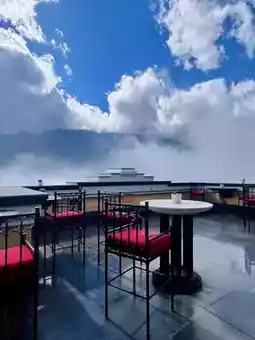 On a clear day, the panoramic mountain views are simply breathtaking — and when the fog lifts, the hotel’s bold yellow backdrop steals the show.
