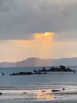 The sunlight reflects off the sea that is gradually changing color