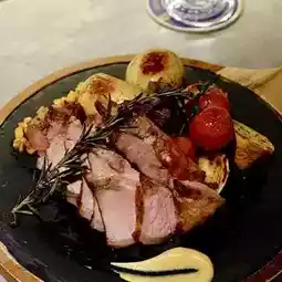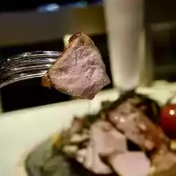 Pork saddle steak 🥩 has been sliced, served with Italian green cucumbers 🥒, 🍅 tomatoes and 🥔 potato dices. The pork has a little fat on the edges and is slightly fried, and is just cooked in the middle ☺️, so the meat is not burnt, but tender 😋. Eat it with caramel apple pieces for a richer taste👍!