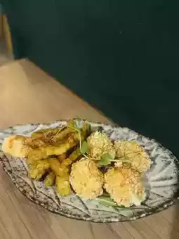 Fried food platter seven choices I chose seaweed squid tempura 🦑 and crispy rice cheese ball 🧀 Usually fried squid is mainly pepper and salt as seasoning, this with seaweed quite special 😯, quite fragrant and squid very good 😚, cheese ball is very creamy, inside the cheese made like cream enough very soft 😋