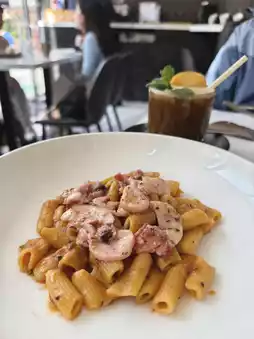 For the main course, I chose the short macaroni. The sauce is the whole point, seasoned with spicy olives and sour beans, spicy and sour, with octopus, rich layers of taste. The heat of the octopus is just right, refreshing enough without being too tough. The pasta is handmade, the texture is bouncy, quite good quality.