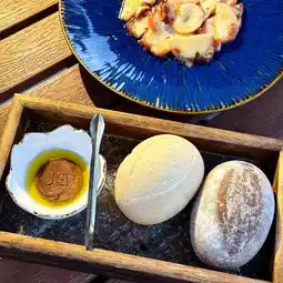 Dip with homemade balsamic butter with the name "JEP" printed on it