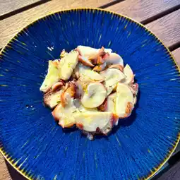 The octopus is soft in texture, seasoned with onion and olive oil, and has a fresh and appetizing cold appetizer of lemon