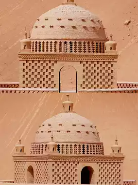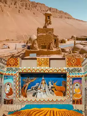 Classic arch-shaped building under the volcano. ❷ Colorful murals opposite the Thousand Buddha Caves