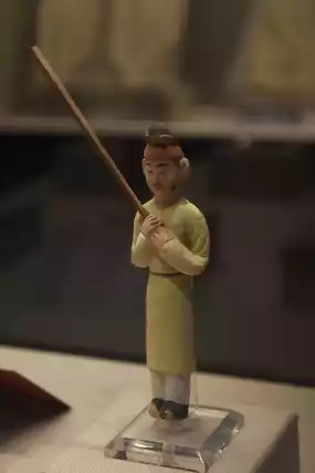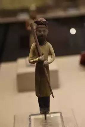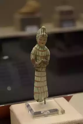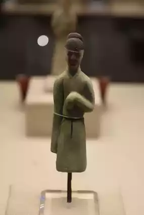 The painted figurines are a symbol of the deceased's identity, in order to continue to enjoy the aristocratic treatment in the world after death. The painted figurines were unearthed from the Astana Tombs in Turpan. They are all made of fired clay, with facial features painted with black pigment, and they are dressed in long robes, black boots, tall hats, and gorgeous clothes.