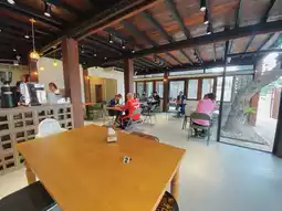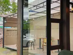 New breakfast restaurant in Ubon. Cafe-style restaurant with a warm homey atmosphere in the style of an old wooden house with a house under the house. The shop is not very big, decorated in earth tones, matching the shade of the trees and the house under the house. There is an air-conditioned area and an open-air area in front of the shop. You can choose to sit in many corners. There are glass all around, making the shop look airy, clean, and comfortable to the eyes.