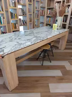 Long work tables with plugs everywhere 💻 There is fast and strong Wi-Fi. It's not crowded. The atmosphere is quiet. It's suitable for those who want to sit and think about work or have a serious meeting, but it doesn't lack creativity. Because the mood of the shop can really stimulate ideas. 🧠💡