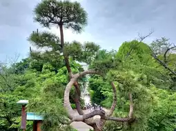 This pine tree, with its curved trunk resembling a full moon, is located in Ueno Park, Tokyo. You can admire this unique and beautiful pine tree from the park's walkway. The park is open 24 hours, but for a closer look, you can visit Kiyomizu Kannon-dō Temple, which is open from 9:00 AM to 5:00 PM. The temple's terrace is a great spot for taking close-up photos of the pine tree.