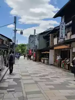 On both sides of the street, souvenir shops, restaurants, and food stalls are lined up, making it a bustling tourist spot.