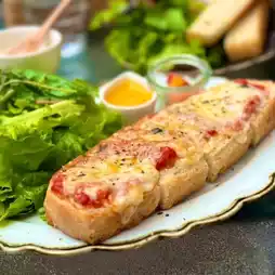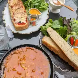 Margherita tartine + seasonal soup and fresh salad 1,300 yen + 300 yen for ice cream parfait