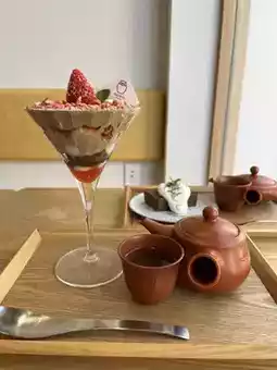 Roasted tea soft serve ice cream, roasted tea cream, shiratama rice cakes, crunchy chocolate, roasted tea castella, and more.