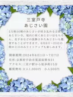 Period: June 1st to July 7th, 2024Address: 21 Shigatani, Uji, Kyoto Access: About 15 minutes on foot from Mimuroto Station Viewing fee: 1,000 yen for adults, 500 yen for children
