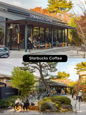 ☕ Starbucks, a famous coffee shop, the atmosphere is very chill. The autumn leaves are very beautiful.