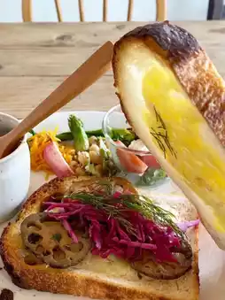 The bread was crispy with cheese spread on it, and then it was topped with red cabbage pickles and lotus root, and you made your own sandwich and ate it✨