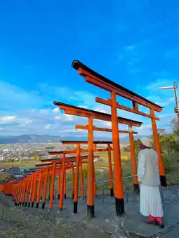 This shrine enshrines the gods of prosperity in business, bountiful harvests, sake brewing and health, longevity, and learning, and enshrines the three gods: Inatama-no-kami (also known as Inari Okami) from Fushimi Inari Shrine in Kyoto, Oyamakui-no-kami from Matsuo Taisha Shrine in Kyoto, and Sugawara no Michizane from Dazaifu Tenmangu Shrine. Since this place is located on the mountain side, if you go through 92 torii gates and climb up, the view from the top is great and refreshing, and if the weather is good, you can see Haratsuru Onsen and Amagi, so it's recommended 🥰