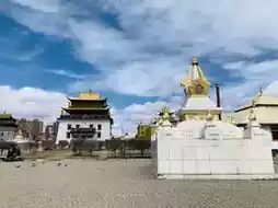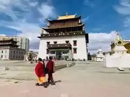 This is a Tibetan Buddhist temple. The Mongolian people have a strong faith in this place, and it should be called the headquarters of Lamaism in Ulaanbaatar. At the very back of Gandan Monastery, there is the Kannon Hall, and inside, there is a large 25m tall Kannon Bodhisattva. This Kannon is said to heal the eyes. There are prayer wheels and small Buddha statues surrounding the Kannon. A prayer wheel is a cylindrical golden ring with a rod through the middle, and when you turn it by hand, it spins easily and smoothly. Inside the cylinder is a sacred sutra, and in Tibetan Buddhism, you turn it twice clockwise. It is said that you will receive the same merit as chanting the sutra. There are many around. Why not try turning them? There are many small Buddha statues in glass cases surrounding the prayer wheel. Each one has a slightly different face. They are said to be Buddha statues of people who donated to the temple.